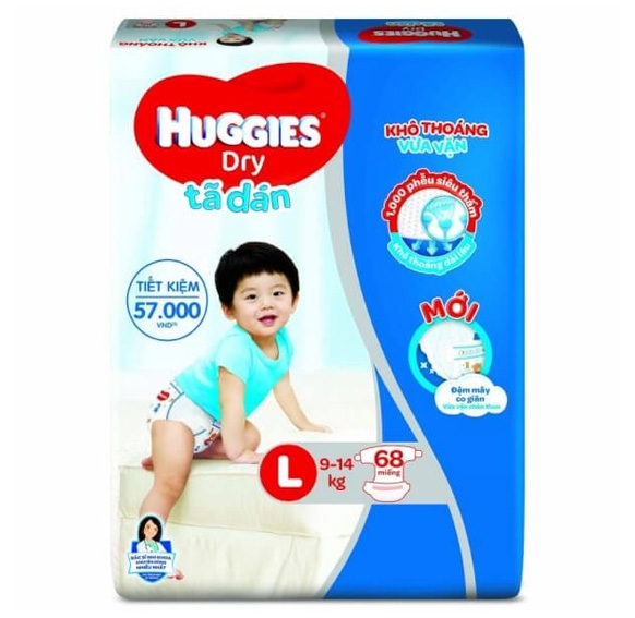 Bỉm tã dán Huggies Dry size L - 68 miếng (9 - 14kg)